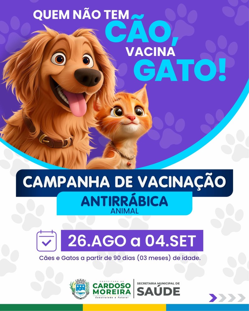A Prefeitura de Cardoso Moreira, por meio da Secretaria Municipal de Saúde, dará início no próximo dia 26 de agosto à Campanha de Vacinação Antirrábica 2025, destinada a cães e gatos a partir de três meses de idade. A ação tem como objetivo proteger os animais contra a raiva e manter o município livre da doença.